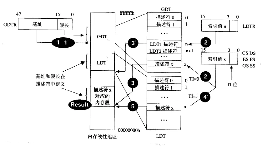 - LDT(Local Descripter Table) 局部段描述符表:16 位长,属于某个进程。一个进程一个 LDT,对应有 RLDT 寄存器,进程切换时 RLDT 改变。 RLDT 和 RGDT 不一样,RLDT 是一个索引值而不是实际指向,指向 GDT 中某一个 LDT 描述项。所以如果要获取 LDT 中的某一项,先要访问 GDT 找到对应 LDT,再找到 LDT 中的一项。 编译程序时,程序内赋予了虚拟页号。在程序运行时,通过对应 LDT 转译成物理地址。故虚拟页号是局部性的、不同进程的页号会有冲突。 LDT 没有空选择子。