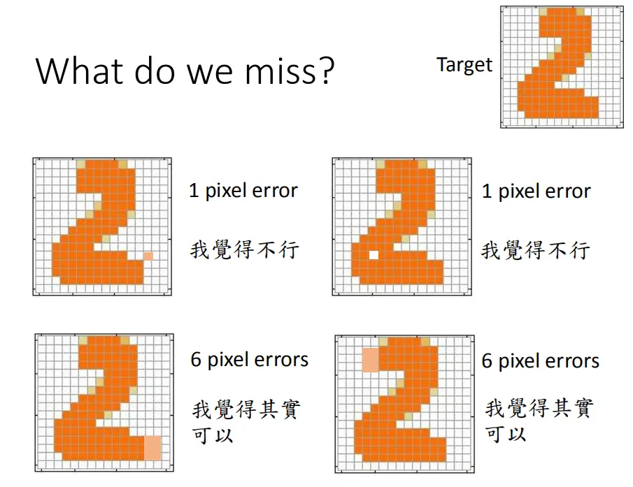如上图所示,如果我们让机器生成了四个版本的“2”的图片。其中 v1 和 v2 与原图只差了一个像素点,v3 和 v4 查了足足 6 个像素点。但是 v1 和 v2 破绽很明显,v1 在尾巴上出现了一个孤立的橘色块,而 v2 在中间留了一块白出来,这都是不自然的。而 v3 和 v4 虽然像素点差距更大,但是其实只是尾巴和头分别拉长了一点罢了,这都是很正常的情况。所以,用这种标准训练出来的模型,它显然缺少一个大局观。只是机械的分别关注全局对象的每一个小组成部分,很难学到组成部分之间的关联。
