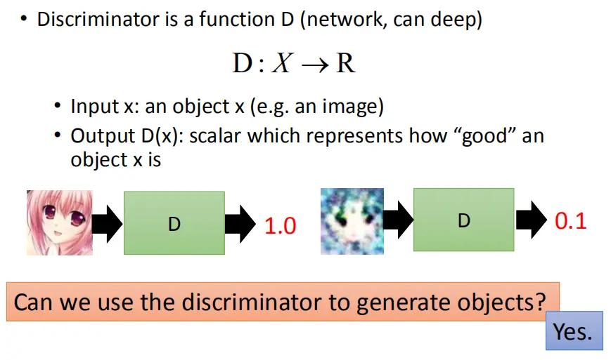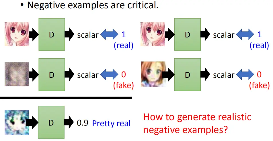 然后我们可以以一个适当的概率分布随机向这个 generator 中输入一组向量,然后得到一堆生成的图片,用这些图片作为反例,用艺术家绘制的图片作为正例训练 discriminator。这轮训练后,得到的 discriminator 的能力得到了提升,能够学会给一些好的图片打高分,给一些差的图片打低分。