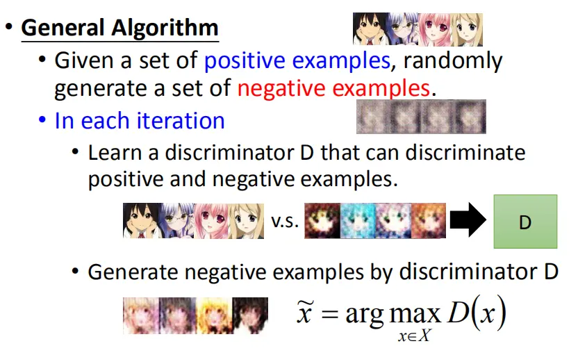 如上图所示。一开始,我们可以随机生成一批反例,然后我们用当前的正例和反例训练出来一个评估器。评估器是个什么东西呢?它本质上也是一个定义在图片域上的函数。我们现在就从这个定义域上采集一批评分很高的图片来作为反例,用新的反例结合之前的正例重新训练,得到下一个版本的评估器。最后不断迭代。