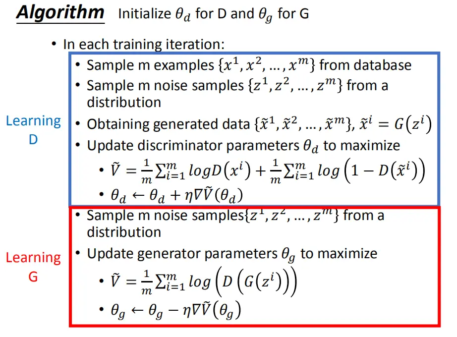 上图是 GAN 的基本训练模式。\(\theta_d\) 和 \(\theta_g\) 分别是 Discriminator 和 Generator 的参数,一开始是随意初始化的。