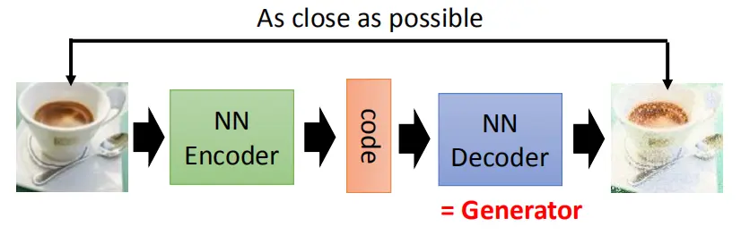 如图,自编码器接收一张图片作为输入,先丢入一个神经网络中产生一个编码作为输出(一个高维向量),这个产生的编码再被丢入另外一个神经网络,恢复成图片。我们希望恢复出来的图片尽可能和输入的图片相近,于是可以定义一个 loss 来衡量图片在这一次编码和解码过程中的损失,根据这个 loss,再使用像梯度下降之类的方法,就可以调整 encoder 和 decoder 的参数,使得其尽可能减少损失。
