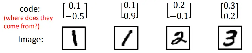 在这样一个自编码,自解码的过程中,我们就既有了编码器和解码器。我们可以只对解码器输入向量,就能得到一个生成图。需要注意到的是,在这样一个自编码器模型中,code 和 image 的映射完全是由模型生成的。模型会自动帮我们调优这个映射的划分。