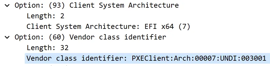 Legacy 和 UEFI 启动需要不同的 pxelinux 文件,因此需要根据 DHCP Discover 中的字段识别客户端是哪种启动方式。