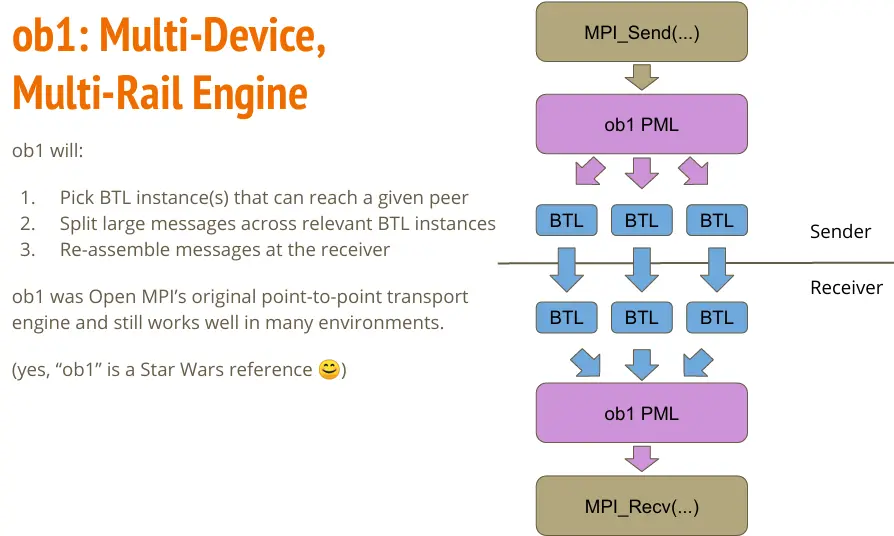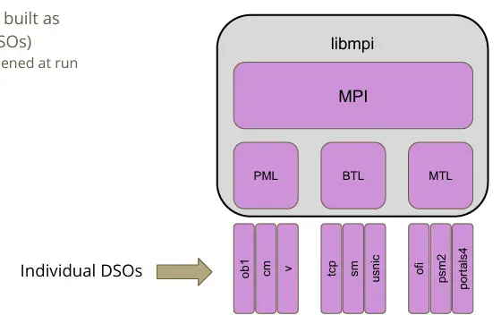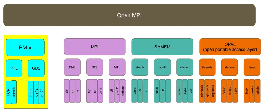OpenMPI 是一个大型项目,采用模块化组织,称为 MCA(Modular Component Architecture),从上至下分为 Project、Framework、Component: